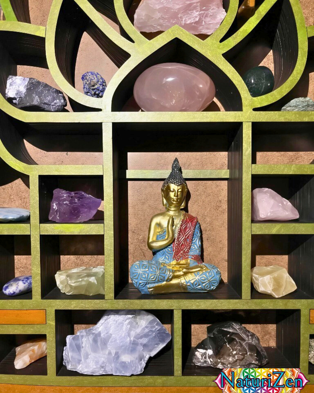 Présentoir mural lotus pour cristaux – Autel spirituel en bois peint, décoration ésotérique artisanale