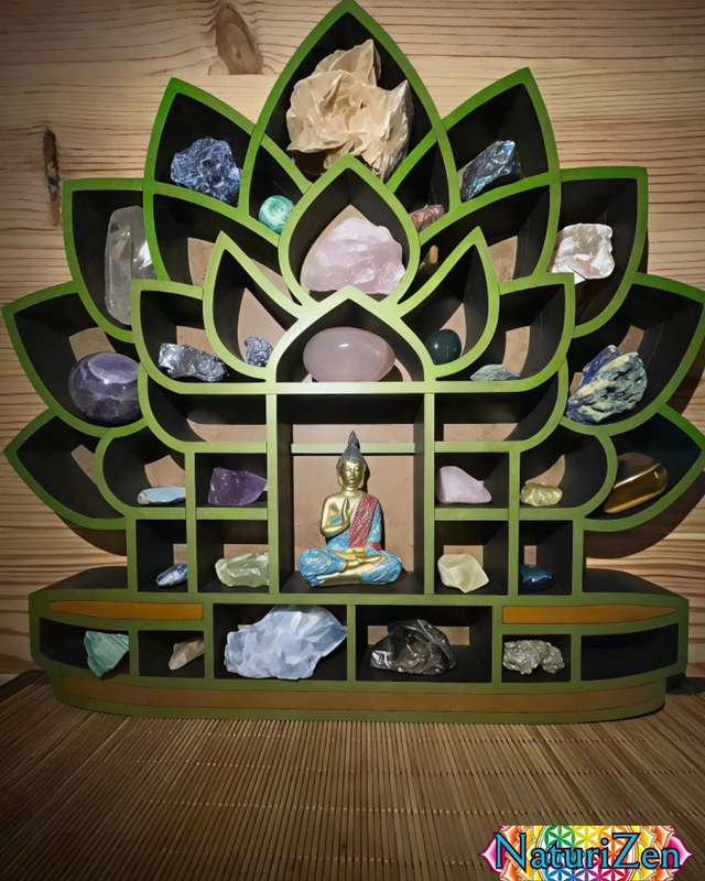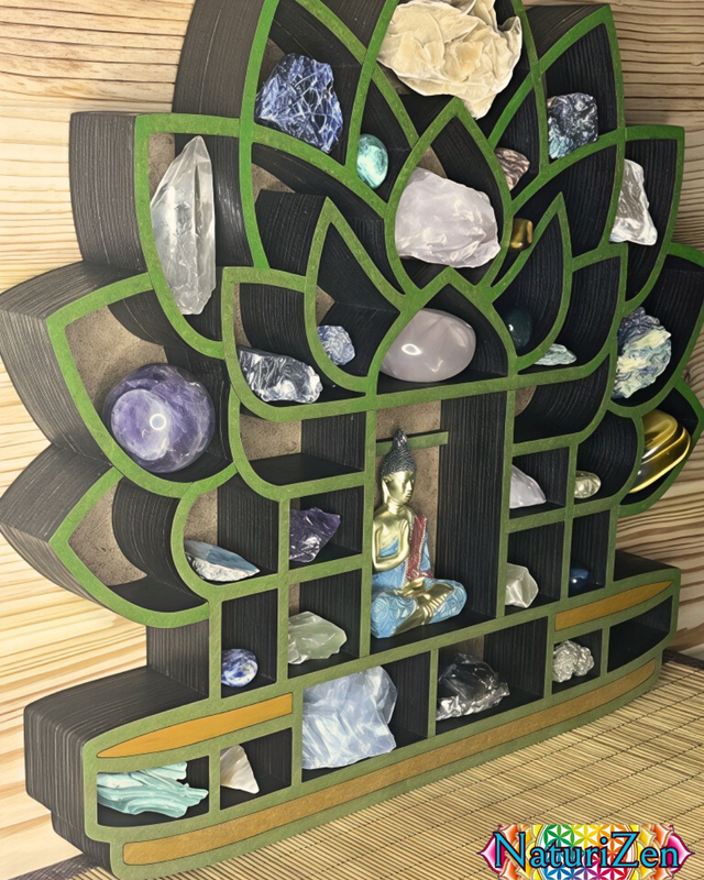 Présentoir mural en bois peint en forme de fleur de lotus, conçu pour accueillir vos cristaux, pierres naturelles ou objets sacrés. Chaque pièce est réalisée à la main, avec soin et intention, dans notre atelier en Bourgogne. La structure multicouche est découpée, assemblée et peinte artisanalement dans des tons verts et noirs profonds, évoquant l’équilibre, la croissance et la protection. Ce présentoir est à la fois décoratif et spirituel : il peut servir d’autel mural, de support énergétique ou de centre de méditation. Sa forme en lotus symbolise l’éveil, l’harmonie et la beauté intérieure. Idéal pour les praticien·nes spirituel·les, les passionné·es de lithothérapie ou toute personne souhaitant créer un espace sacré chez soi. Chaque pièce est unique.